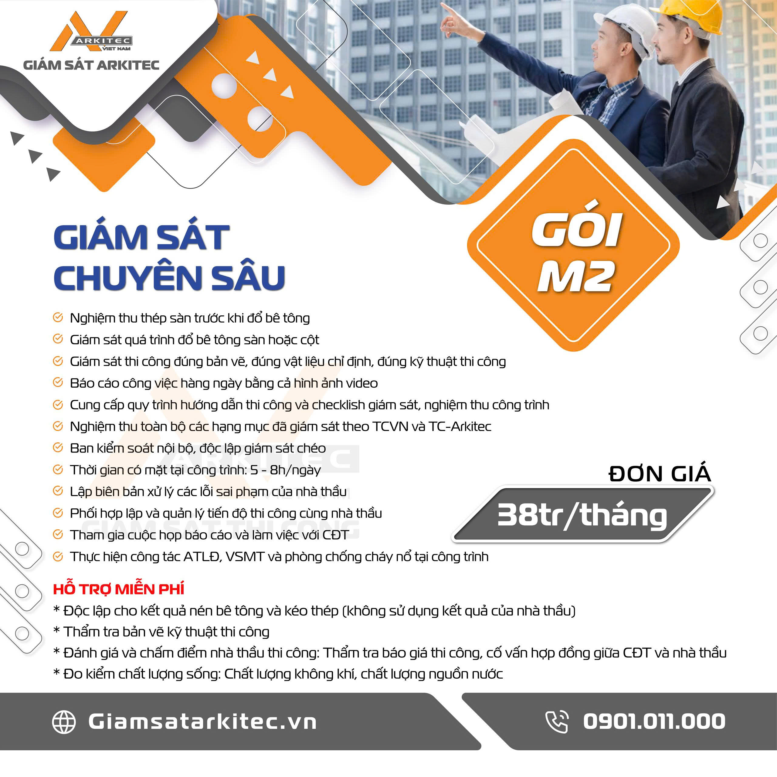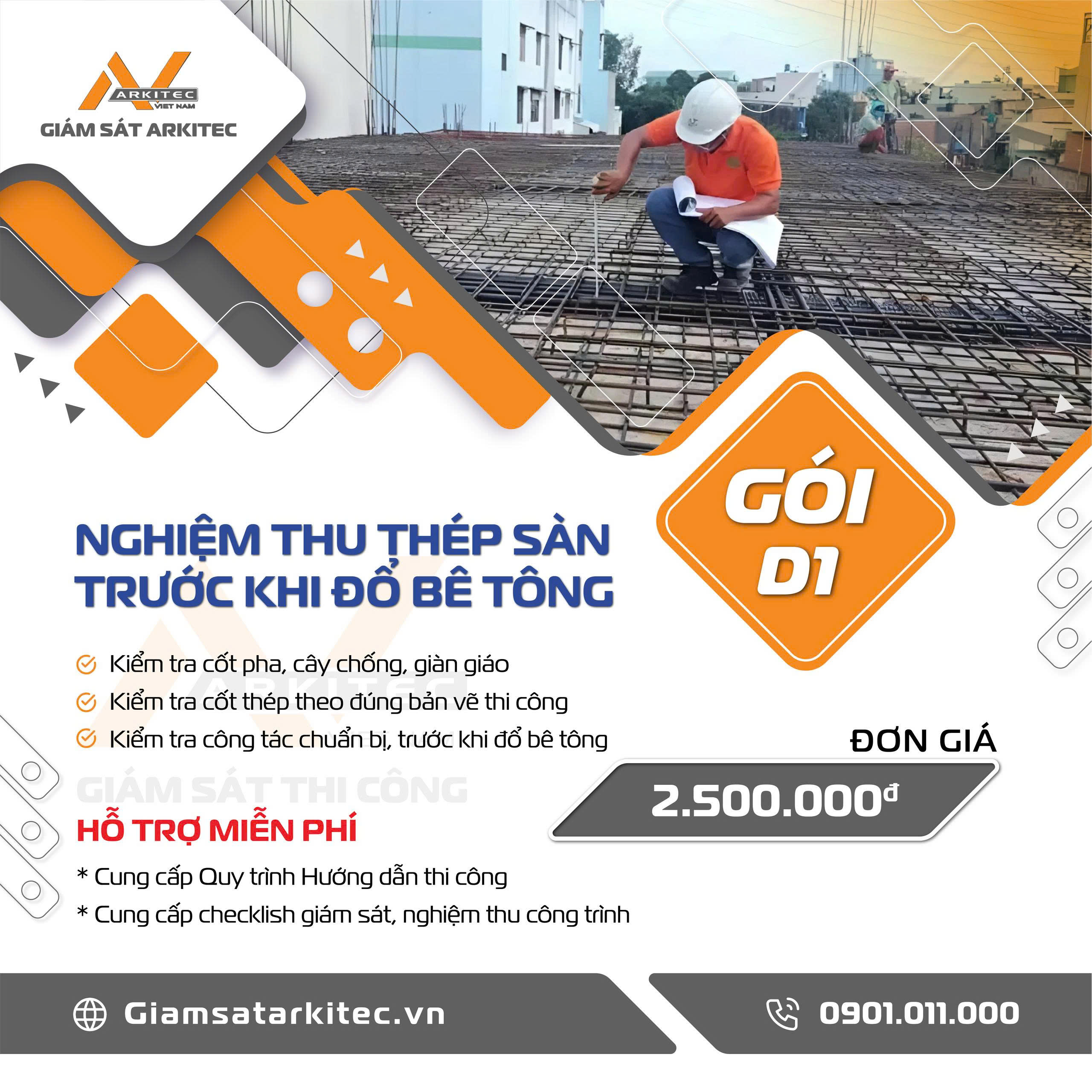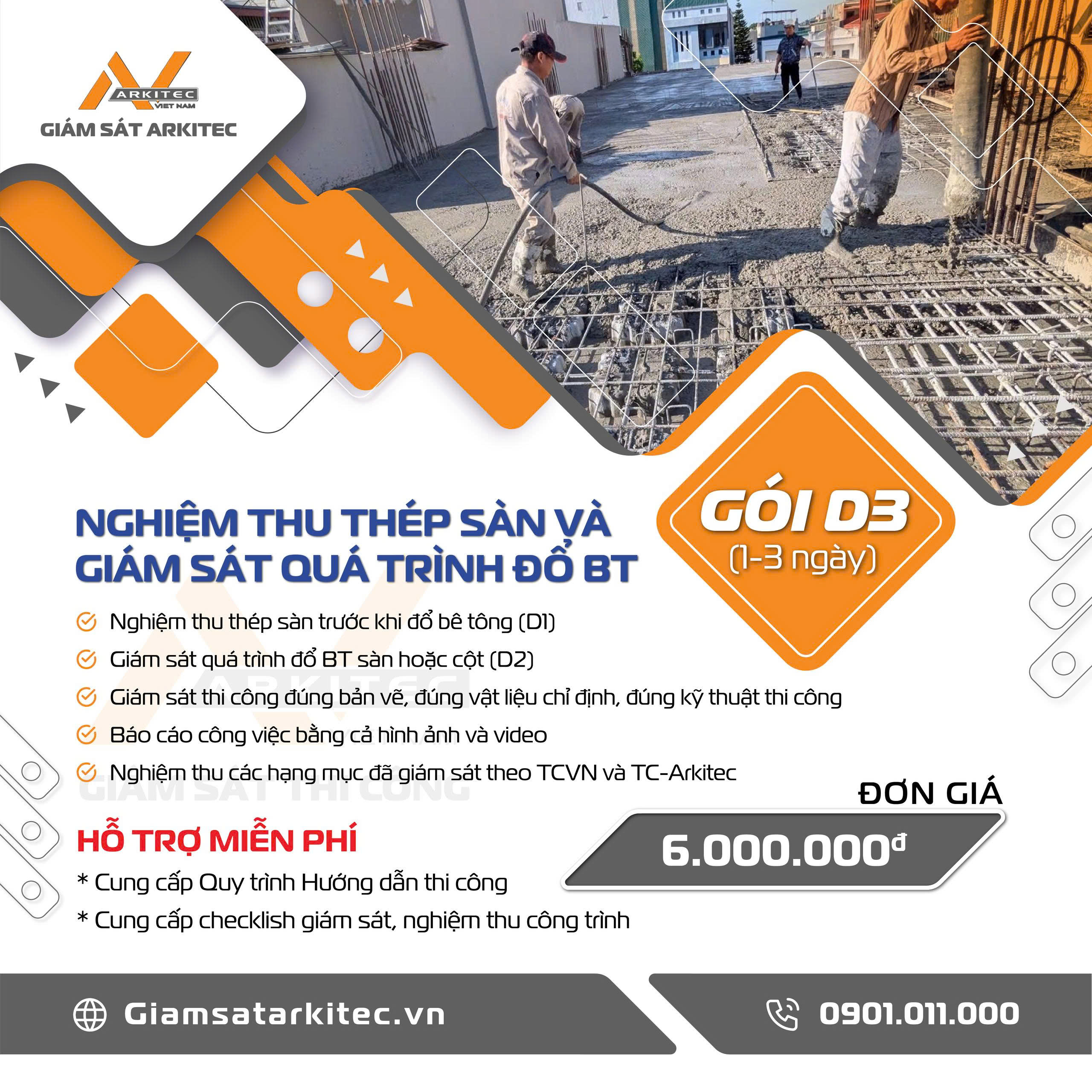 Khách hàng có thể thuê giám sát theo từng ngày các công việc quan trọng như : … trừ các công việc liên quan tới nghiệm thu thép sàn và giám sát quá trình đổ bê tông như ở mục 2, và 3.