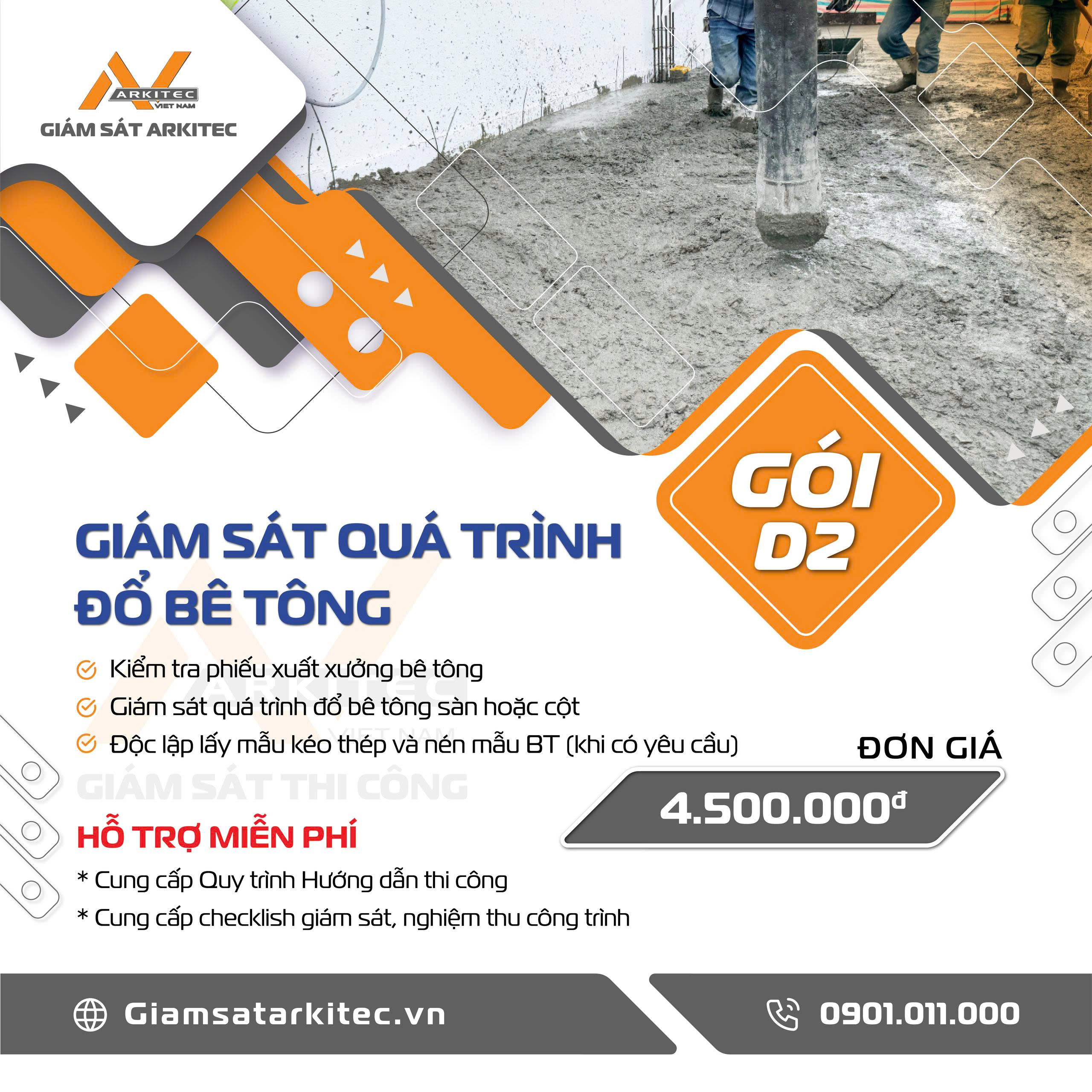 Là quá trình cán bộ giám sát rà soát lại toàn bộ công tác cốt pha và giáo chống, đảm bảo quá trình đổ bê tông diễn ra an toàn, chất lượng. Song song giám sát quá trình đổ bê tông, đốc thúc nhà thầu thực hiện kỹ thuật đổ bê tông 1 cách hiệu quả, sau đó lấy mẫu nén bê tông (miễn phí) và kiểm tra chất lượng bê tông 1 cách độc lập thông báo cho Khách hàng làm căn cứ nghiệm thu.